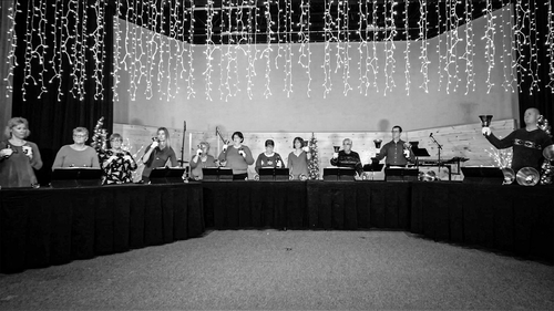 If you’ve ever wondered what is a handbell choir, then picture a piano with it’s many keys, but instead of one person playing all those notes there are many people. Each person takes 2-4 keys and learns to play in time with each other. Standing side by side together they read and play individual notes working together to share their song.
