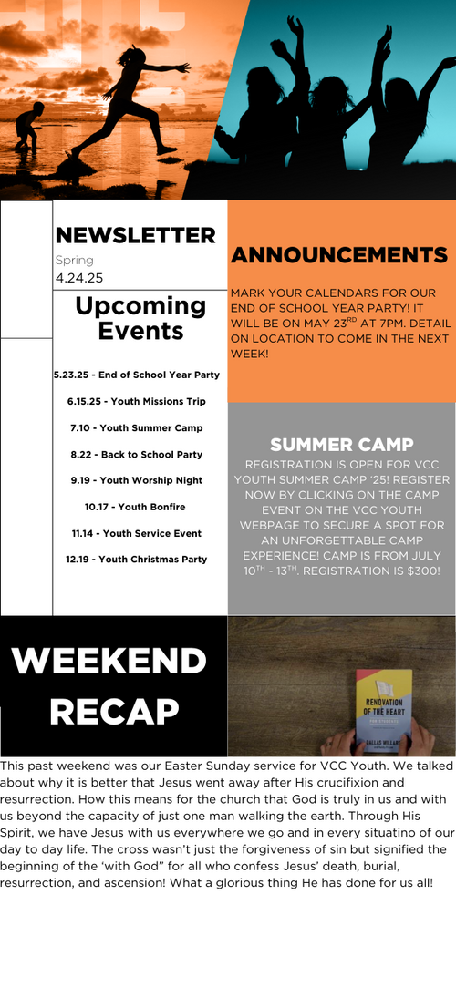 If you are in 5th - 12th grade, join us on Sunday mornings in the VCC Youth Room (located at the far North end of the building) at 10:45am for worship, teaching, and small groups! We also have a High School small group that meets on Sunday Evenings in the Youth Room at 6pm - 7:30pm.