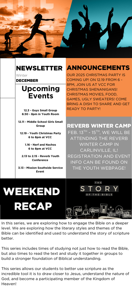 If you are in 5th - 12th grade, join us on Sunday mornings in the VCC Youth Room (located at the far North end of the building) at 10:45am for worship, teaching, and fun! We also have small groups that meet during the week for Middle School Girls, High School Girls, and Youth Guys!